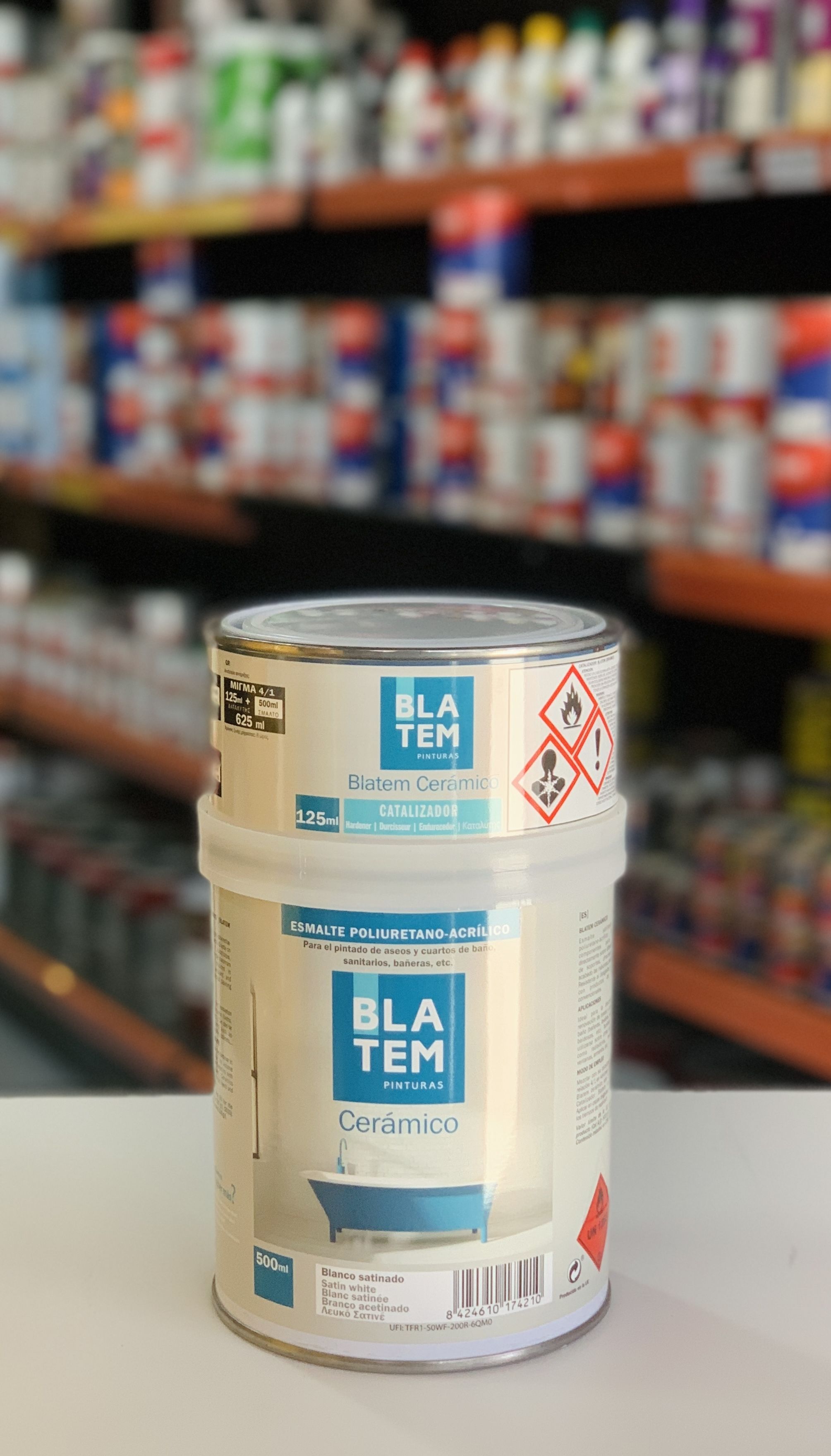 Esmalte de poliuretano-acrílico de dos componentes para el pintado de aseos y cuartos de baño, sanitarios, bañeras, baldosas, cerámica, gres, etc. Acabado satinado (semibrillante). Rendimiento 9-12 m2/L.